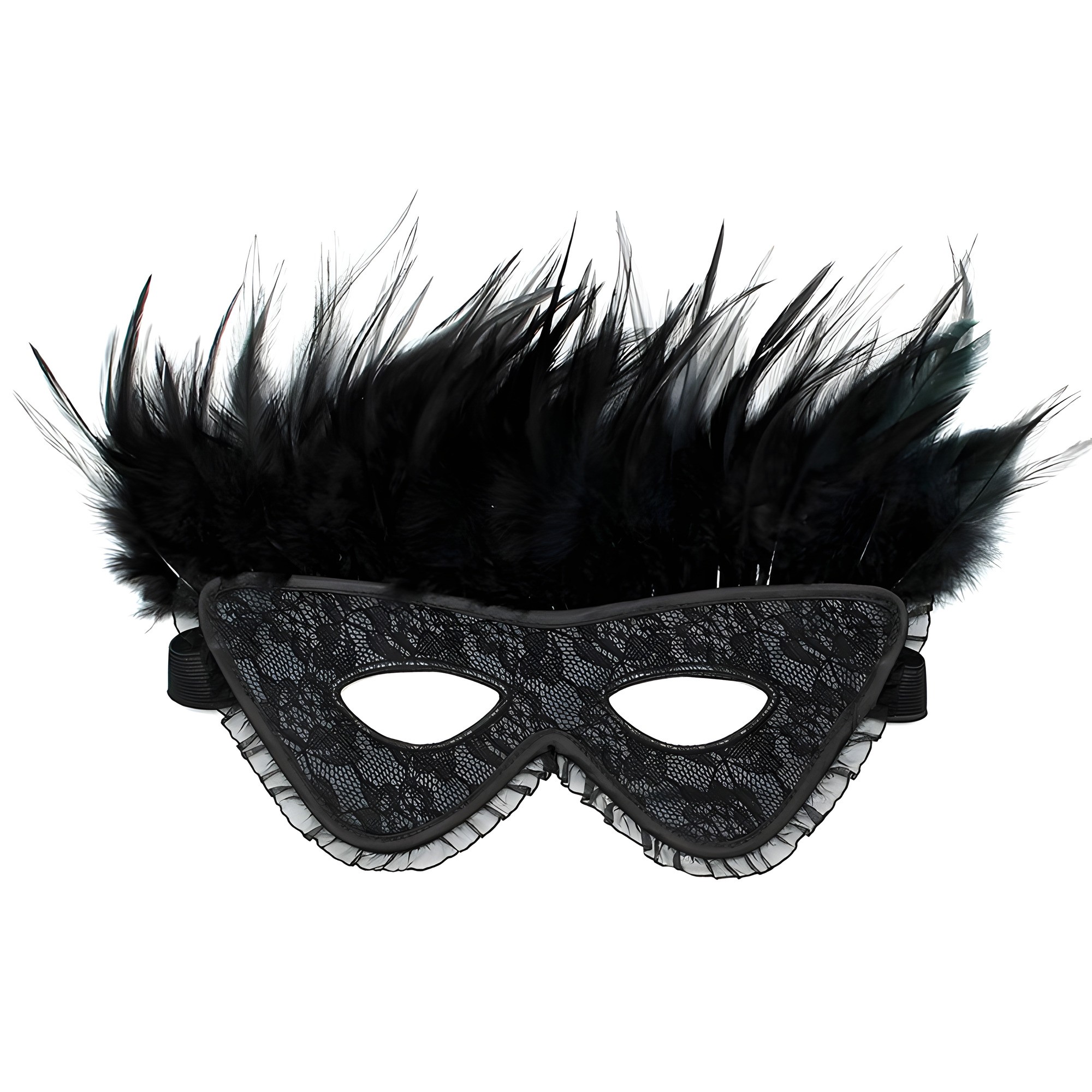 This stunning black mask features a delicate lace overlay and is adorned with luxurious black feathers at the crown, perfect for adding a touch of mystery to any outfit.