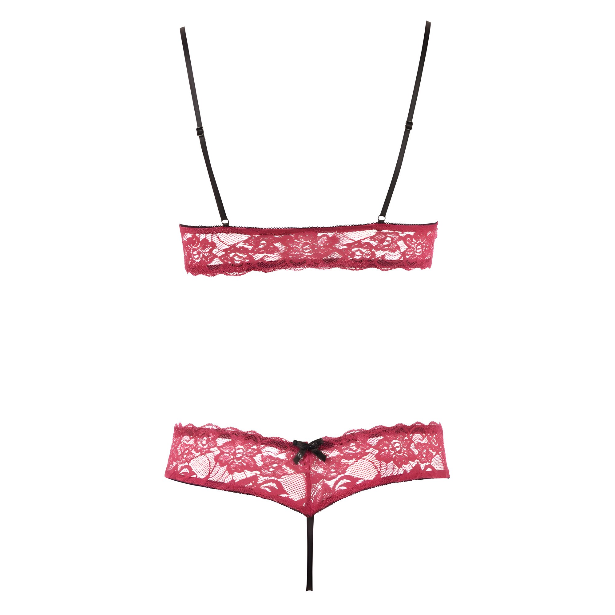 This alluring red ensemble features a wireless bra with open cups and adjustable black straps, designed to enhance your curves.