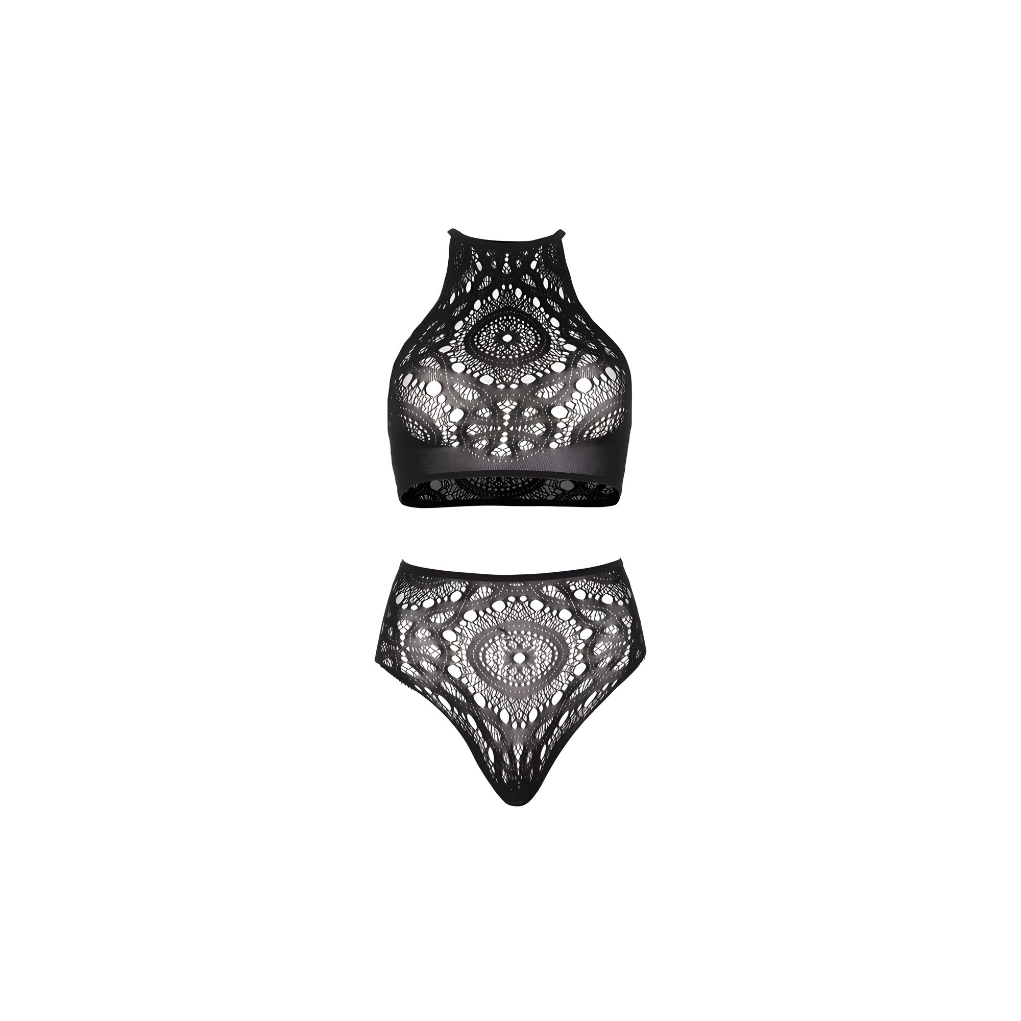 This two-piece ensemble features a crochet lace halter crop top with a strappy back and a matching high waist string, ensuring you look stunning and feel confident.