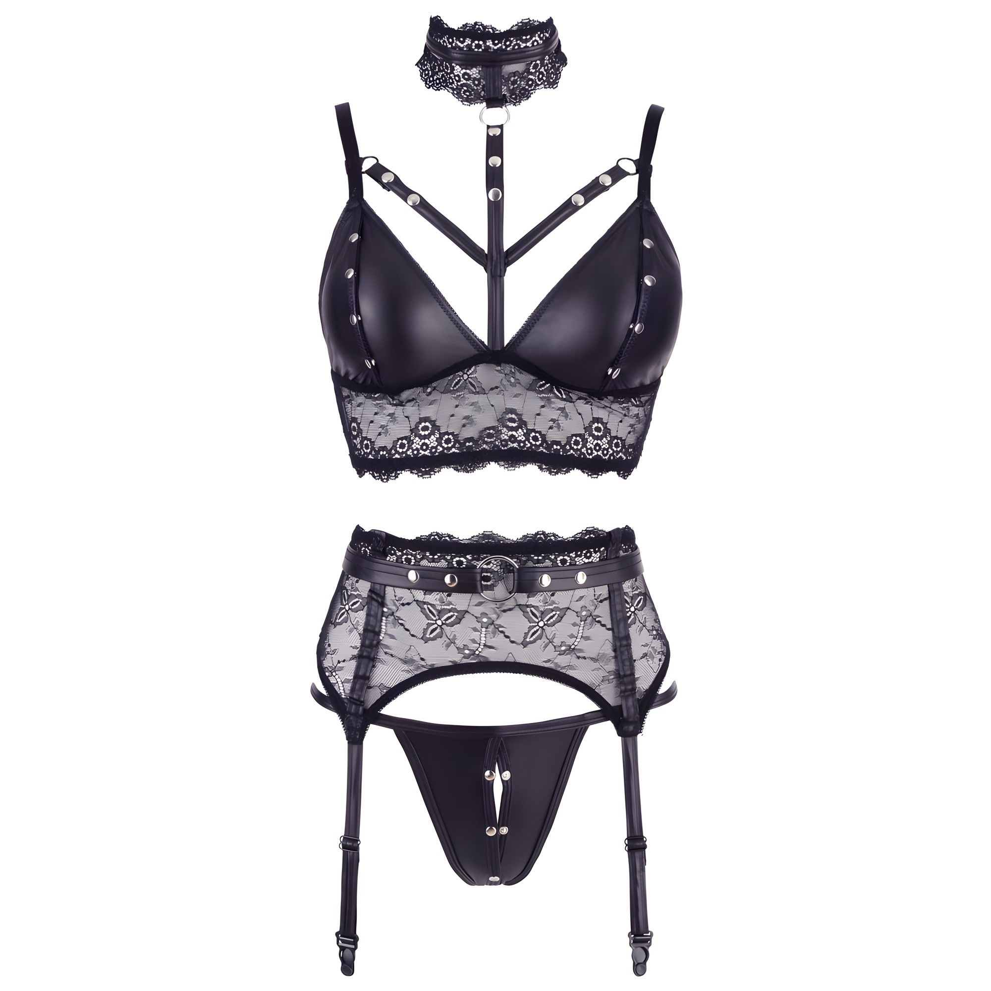 This 3-piece lace ensemble features a bralette with removable cups, adjustable suspender straps, and stylish handcuffs.