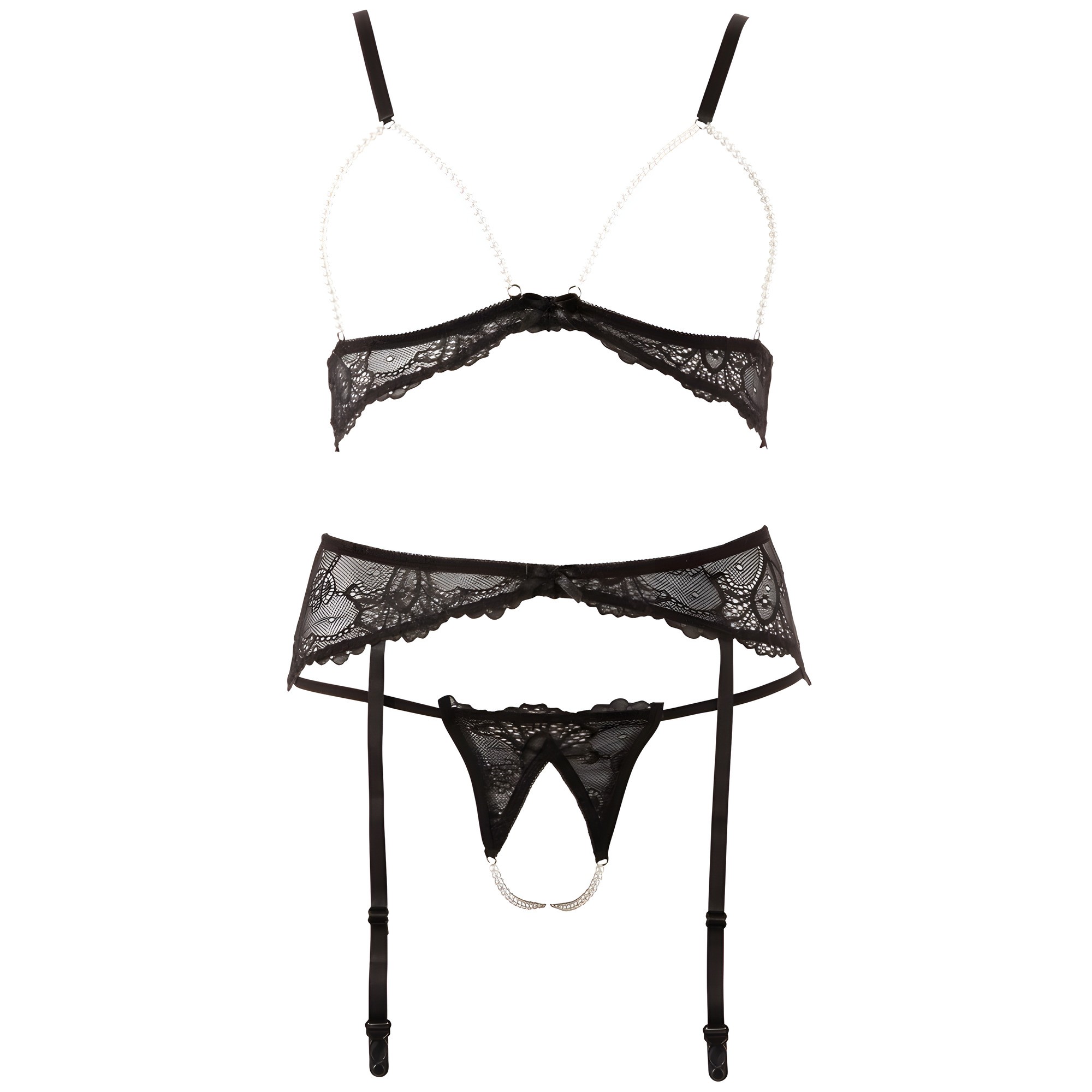This exquisite lace set includes a wireless bra, crotchless string, and suspender belt.
