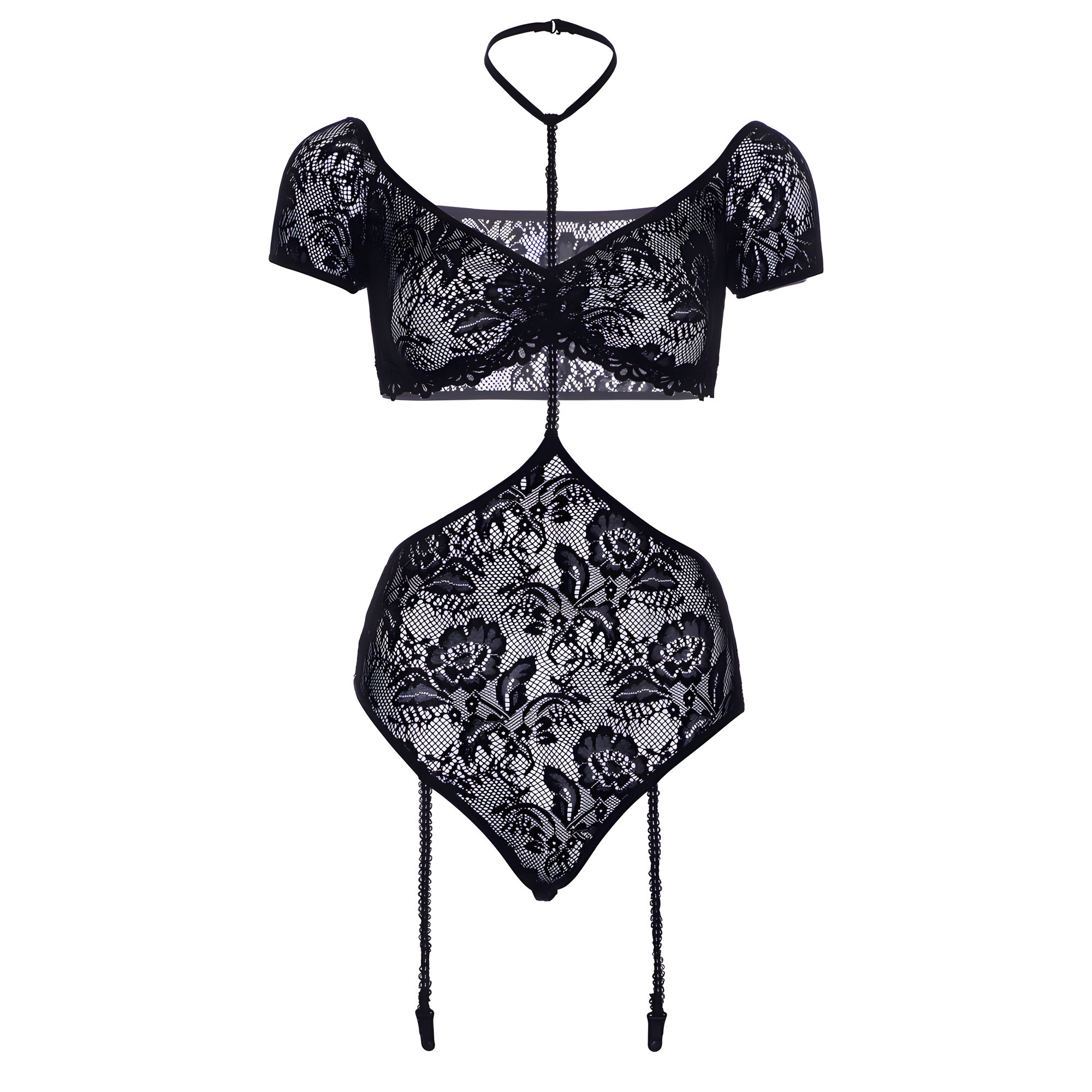 This stunning 2 piece set features an intricate lace bandeau top with elegant cuff sleeves, complemented by a daring halter harness and sexy garter teddy.