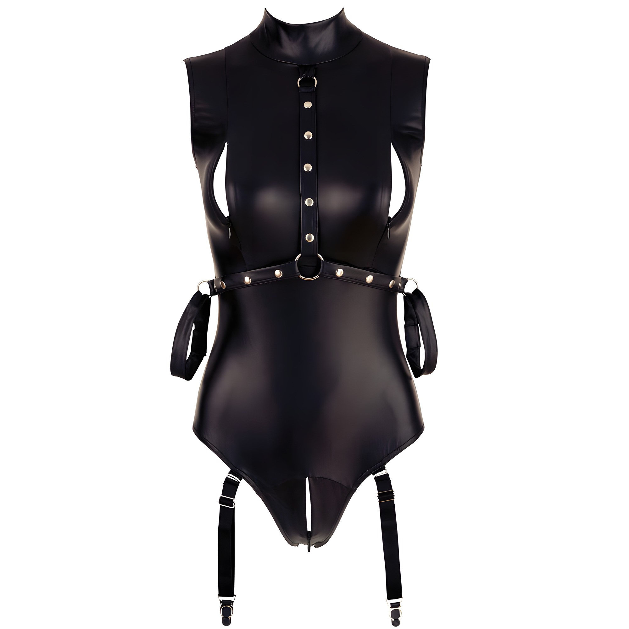 A strict dominant look with soft, comfortable material! This stretchy body in a matte black finish features metal details and suspender straps, complete with zips over the breasts and decorative studs.
