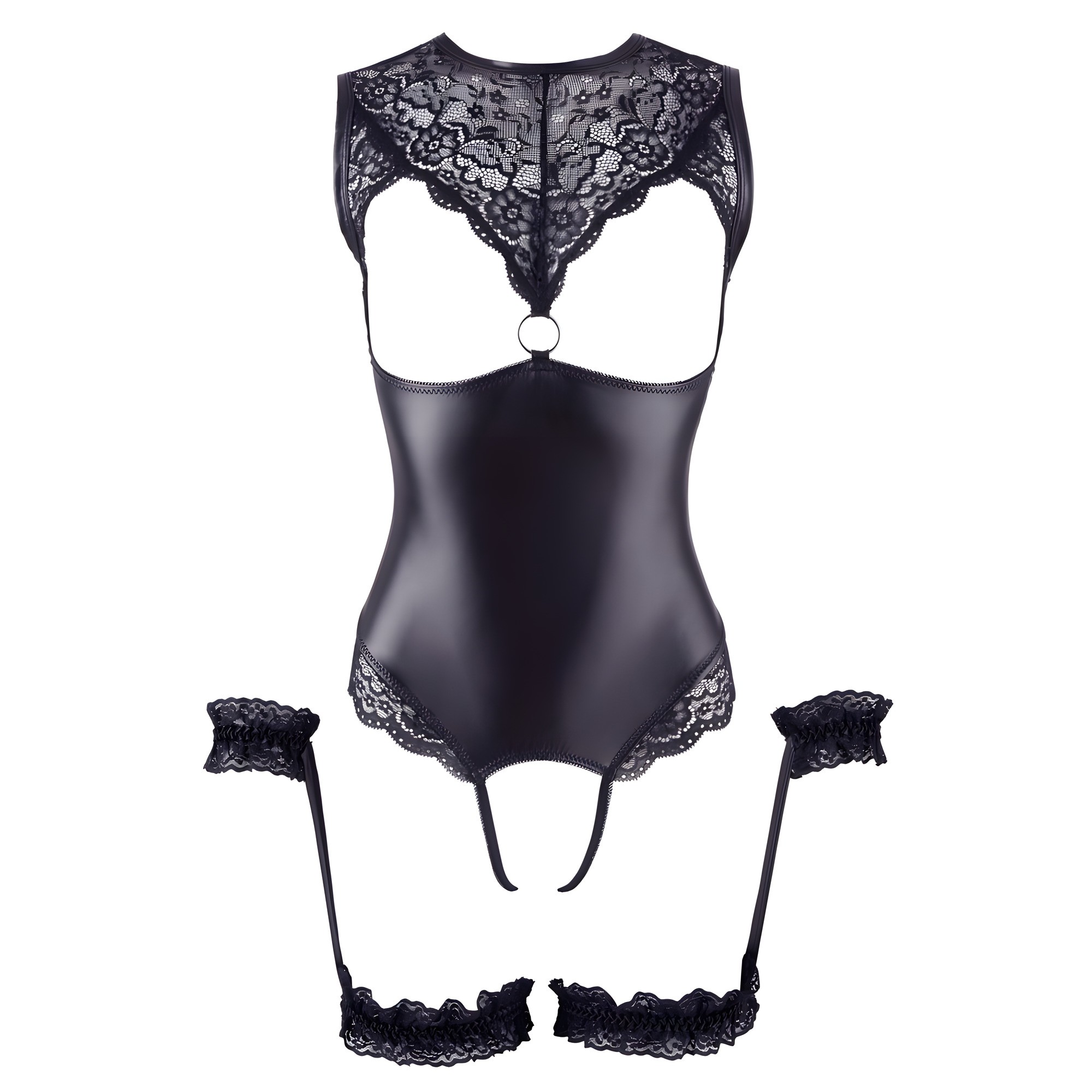 This high-neck body features an open design and includes garters with handcuffs for added excitement.
