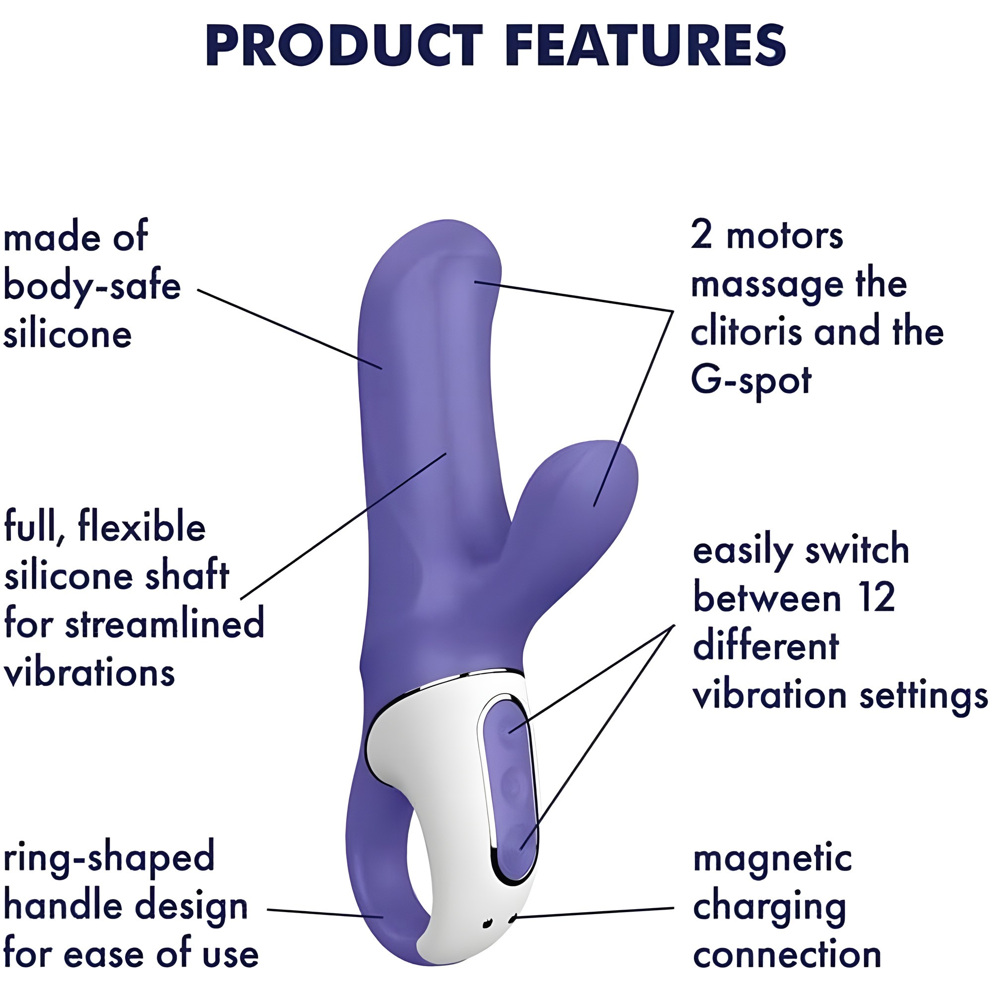 This rechargeable G-spot vibrator features two strong motors for simultaneous stimulation of your G-spot and clitoris.