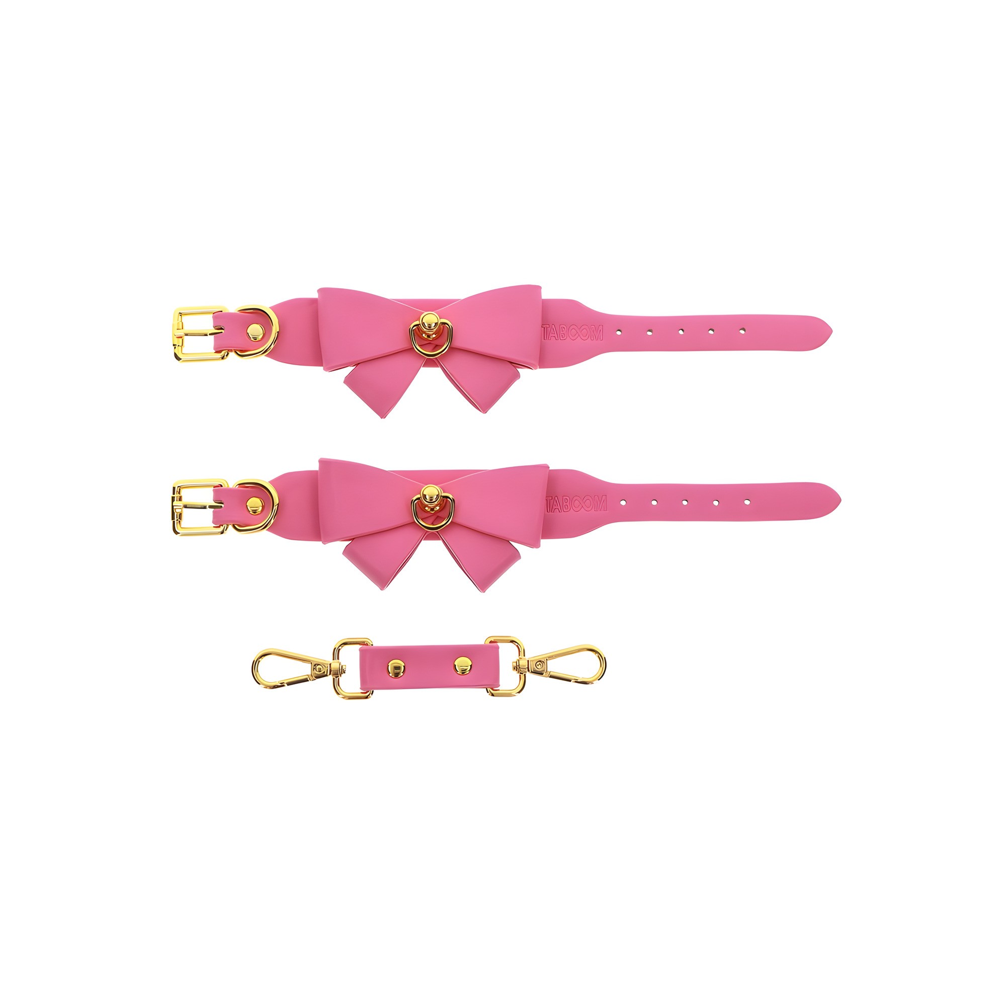 Crafted from vegan PU leather, these pink cuffs feature a delightful bow and gold-plated metal details.