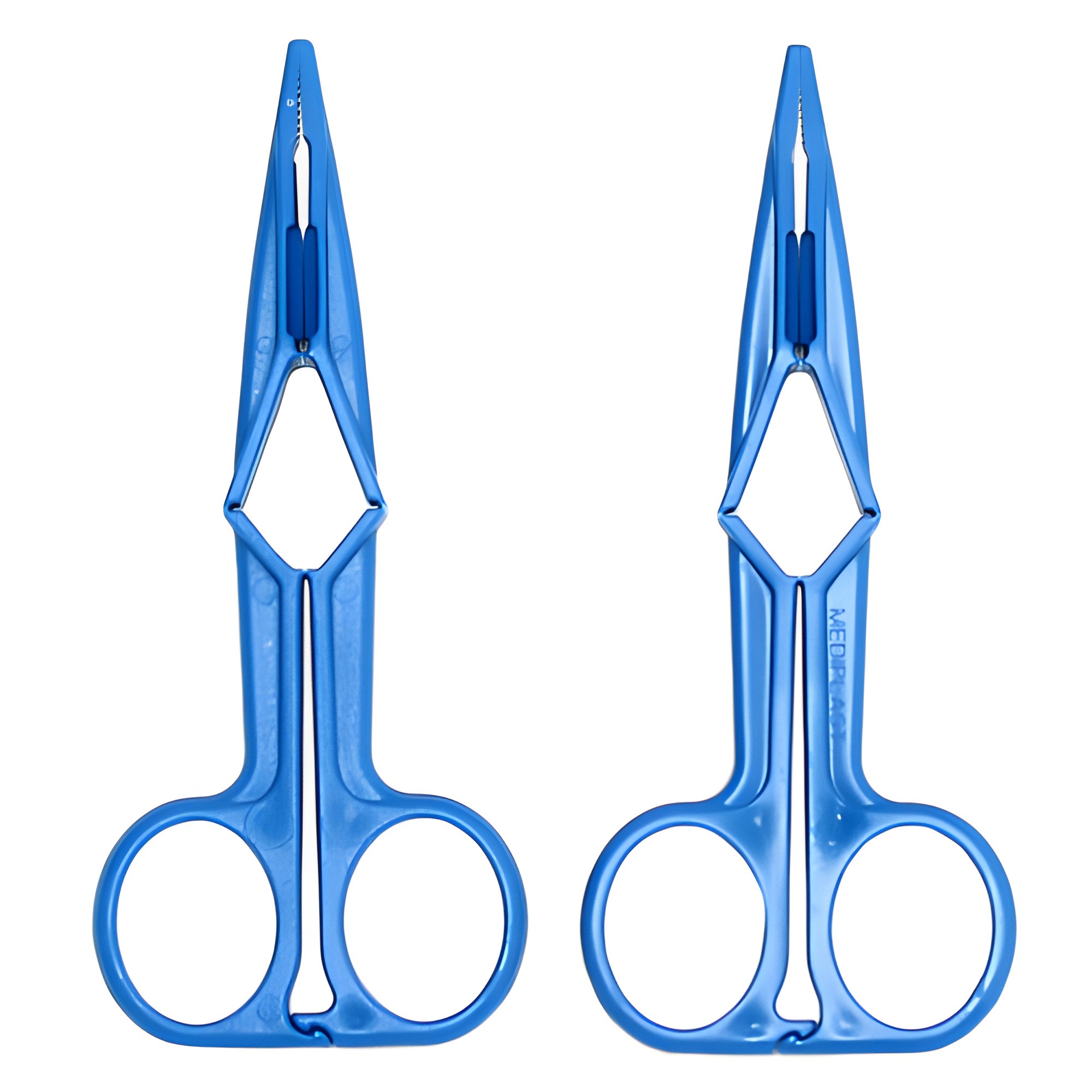 These blue scissor action nipple clamps are crafted from synthetic material, designed to enhance sensitivity and pleasure.