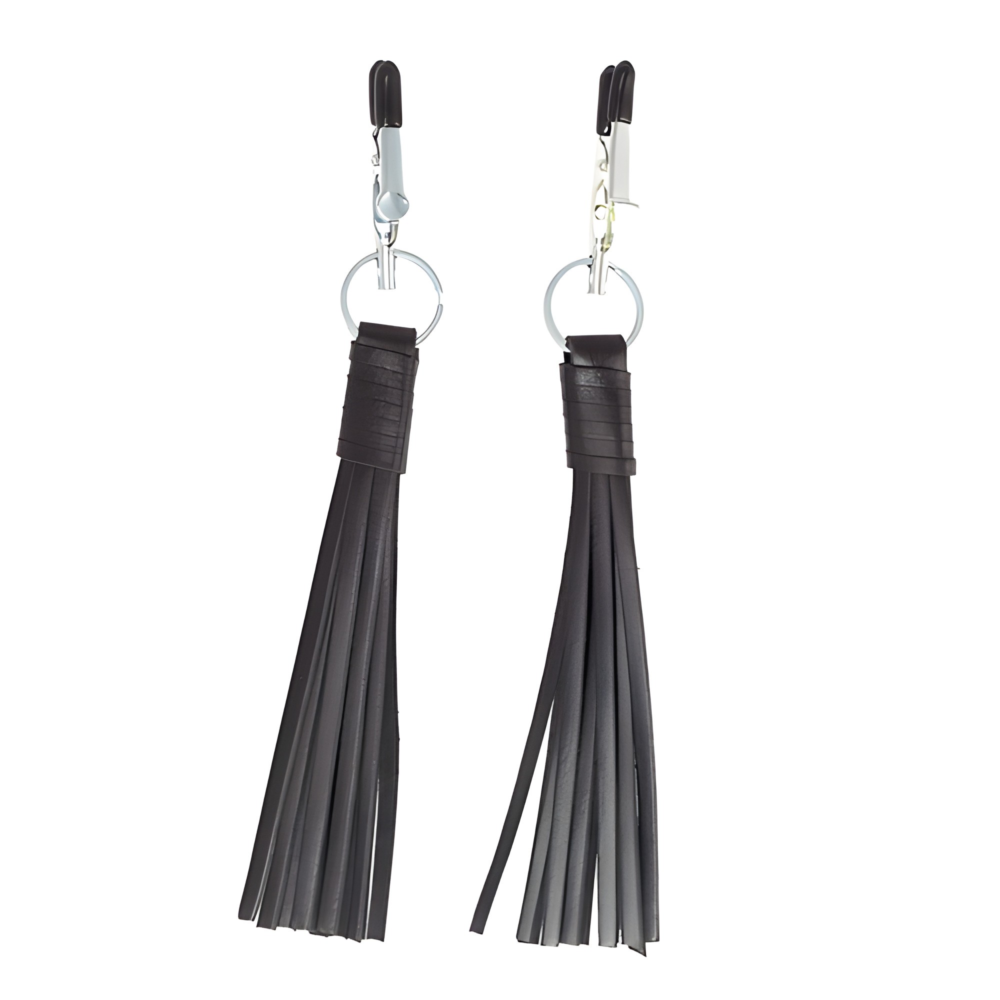 Explore new sensations with Nipple Clamps featuring elegant black leather tassels.