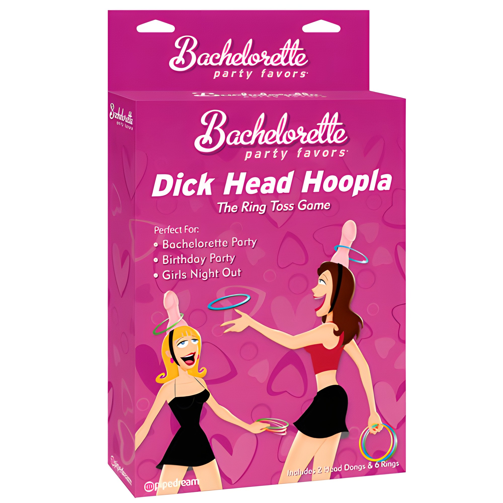 Get ready for fun with the Dick Head Hoopla, a playful game featuring strap-on penis-shaped dongs and colorful rings.