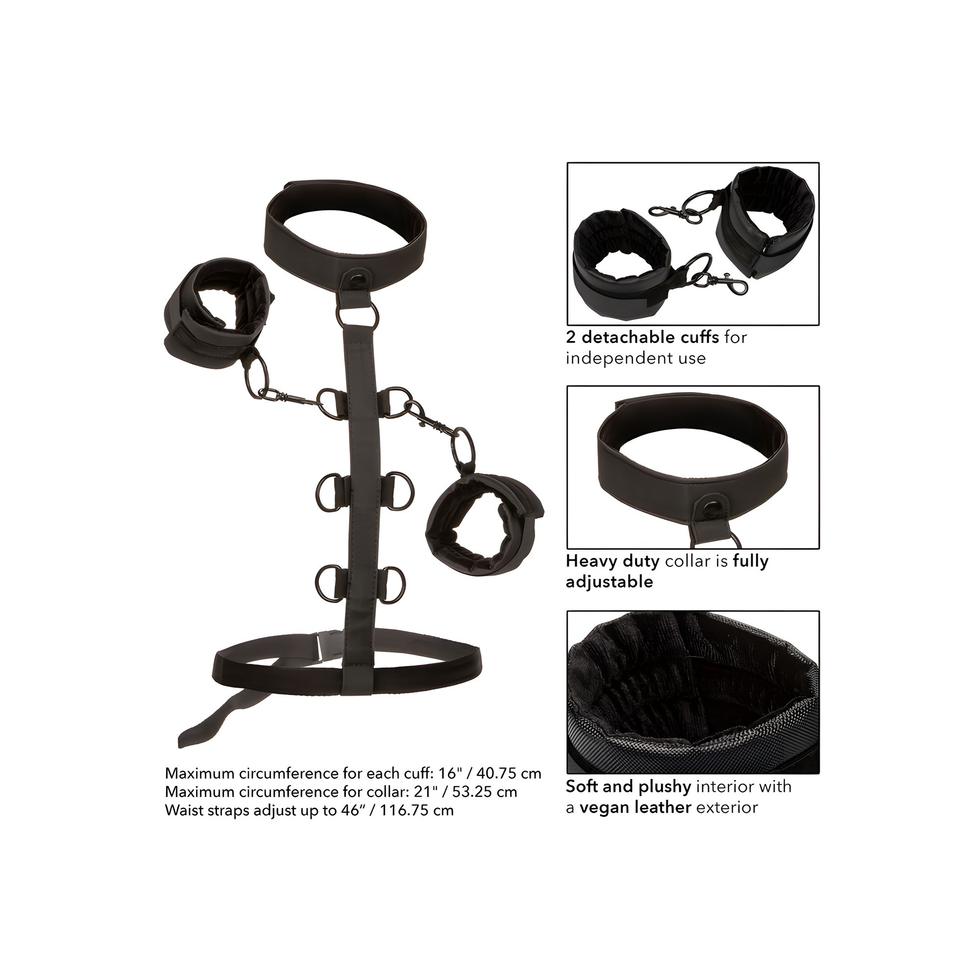 This daring restraint system includes vegan leather cuffs, a heavy-duty collar, and a multi-level restraint tether for endless possibilities.