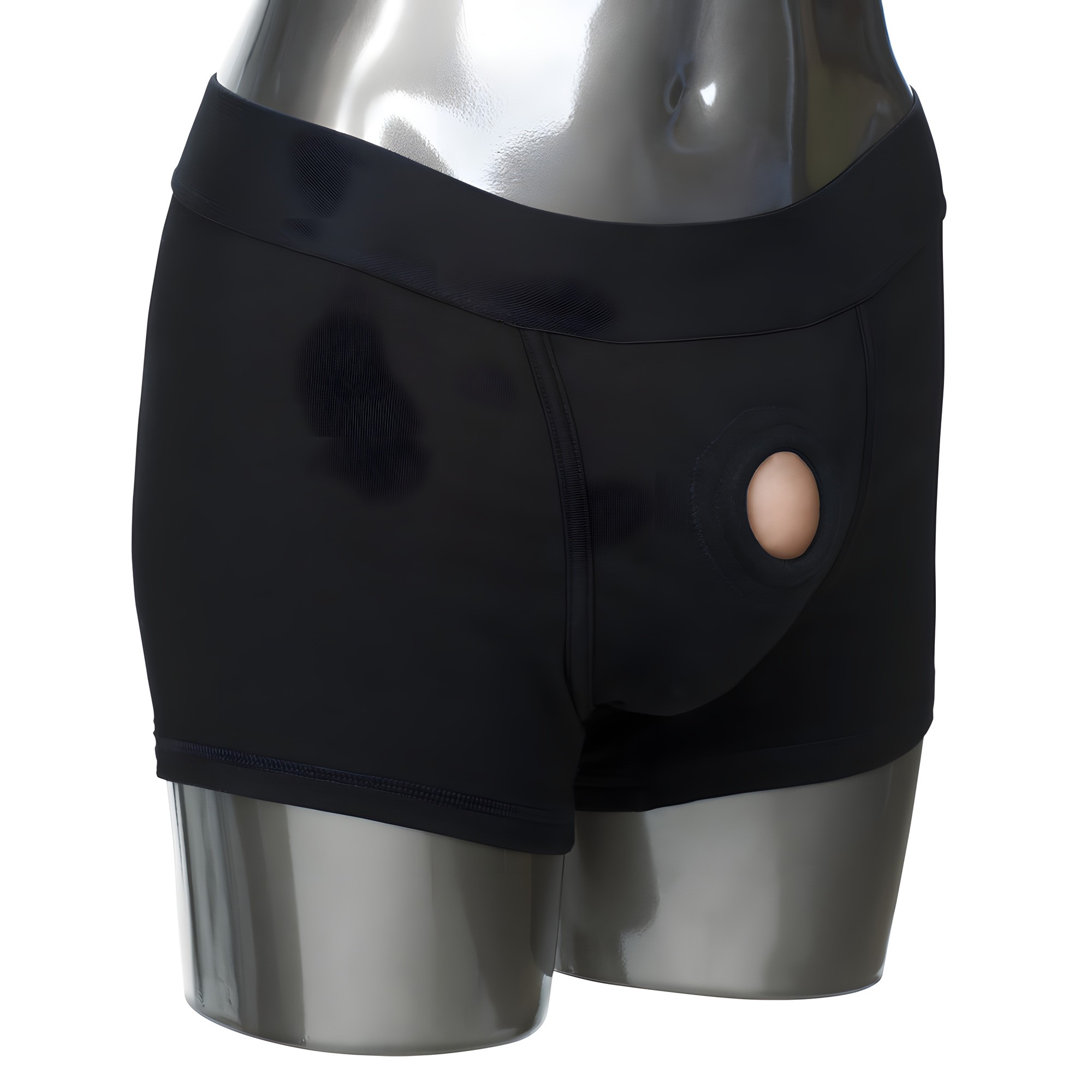 This black boxer brief harness allows you to add your own dong or stimulator, providing a discreet two-panel design perfect for dual penetration.