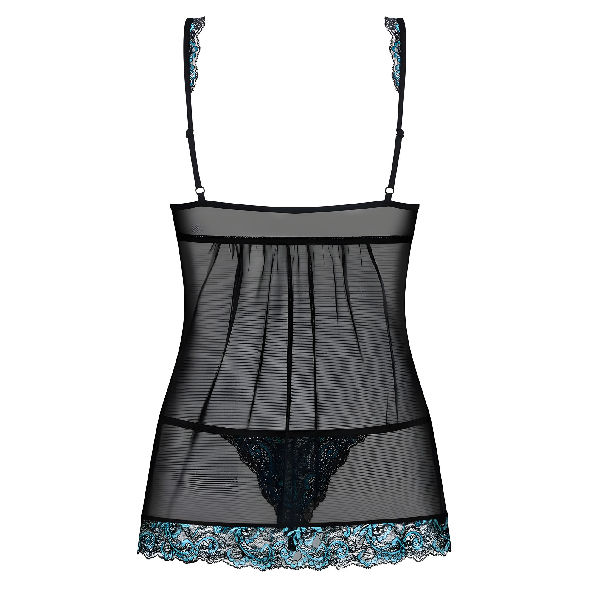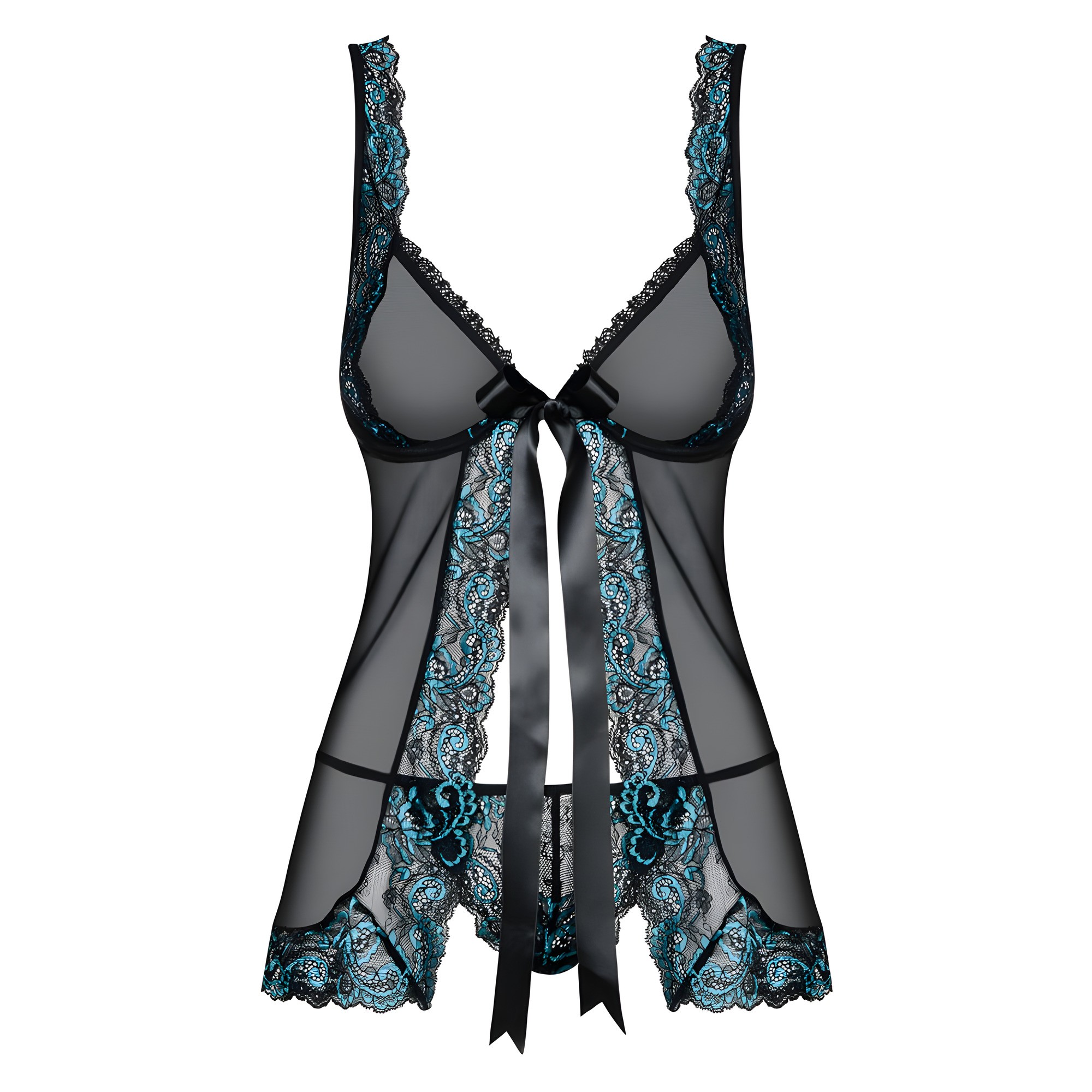 Esta pieza transparente presenta delicados acentos de encaje y un atrevido diseño de frente abierto, perfecto para encender la pasión.