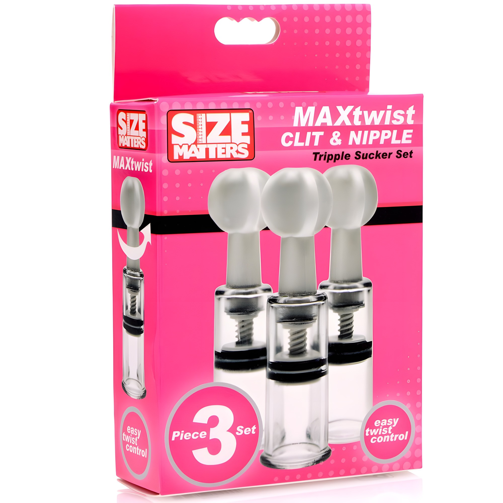 Disfruta de sensaciones intensificadas con el Set de Succionadores Triple para Clítoris y pezones Size Matters Max Twist.