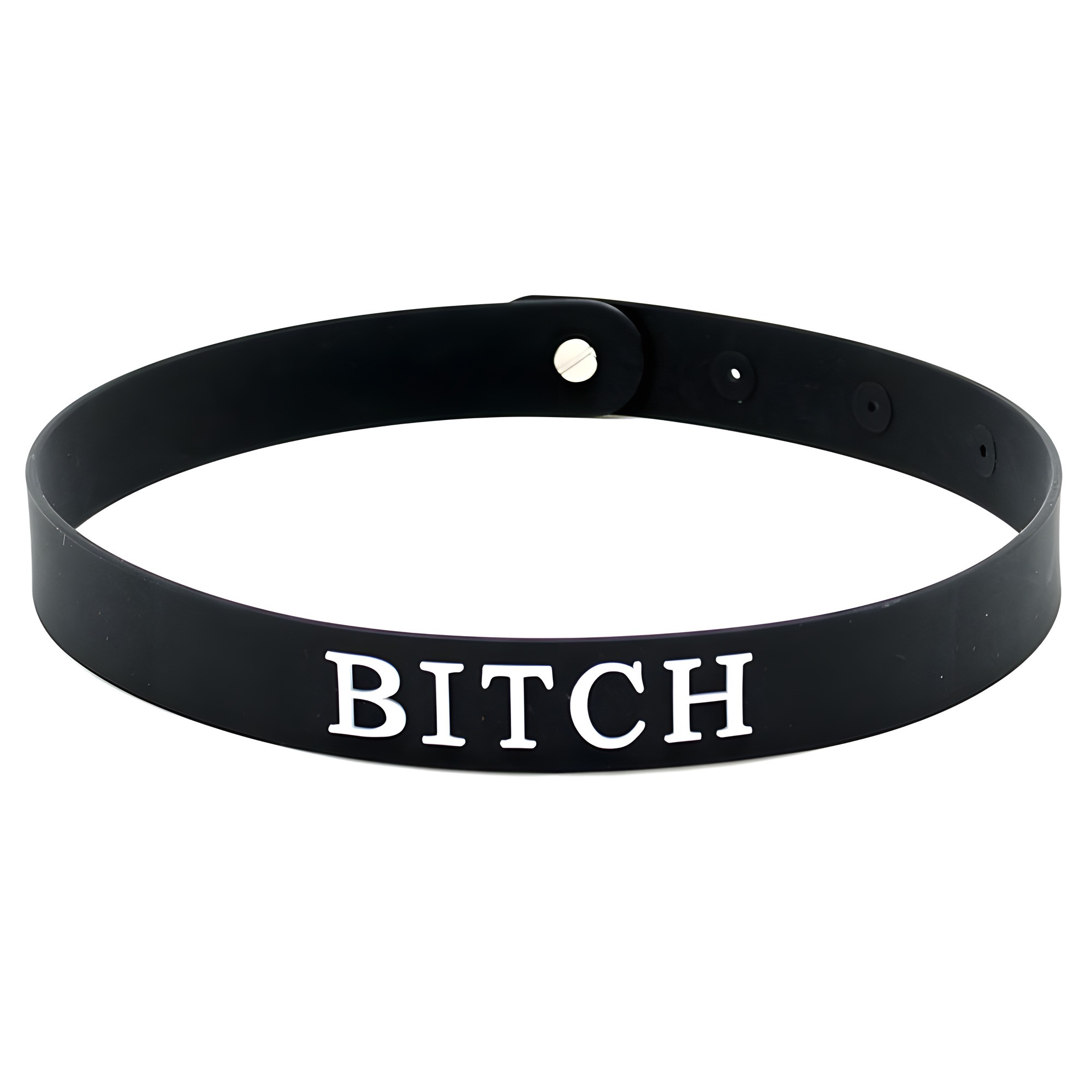 Este collar ajustable presenta la palabra 'BITCH' en blanco, perfecto para aquellos que aman expresar su lado dominante.