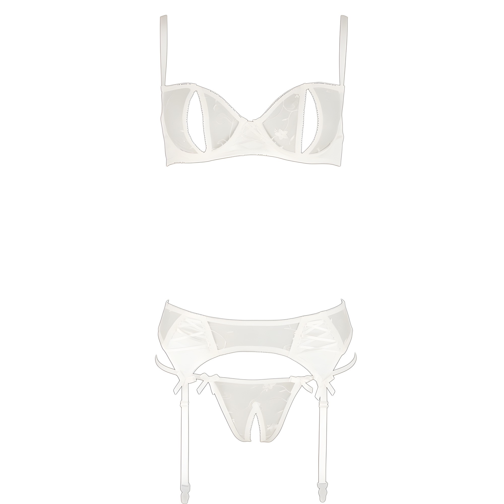 Este exquisito conjunto presenta una suave tela de red blanca combinada con lujosa satén elástico y pequeños lazos para un toque delicado.