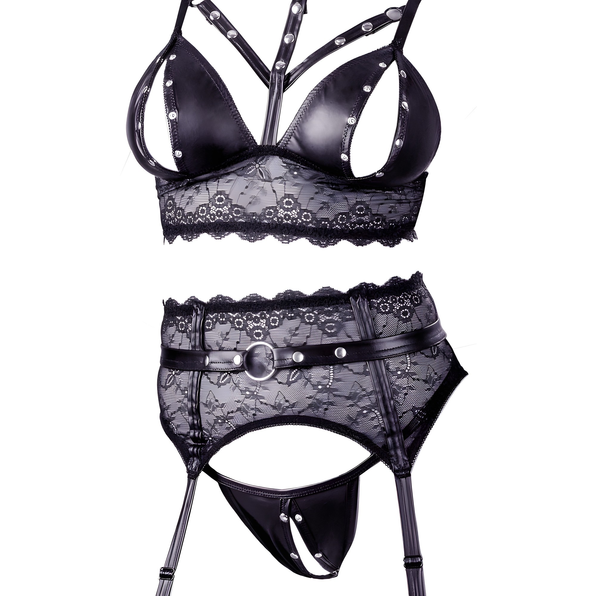 Este conjunto de tres piezas de encaje presenta correas ajustables y grilletes removibles para juegos personalizables.