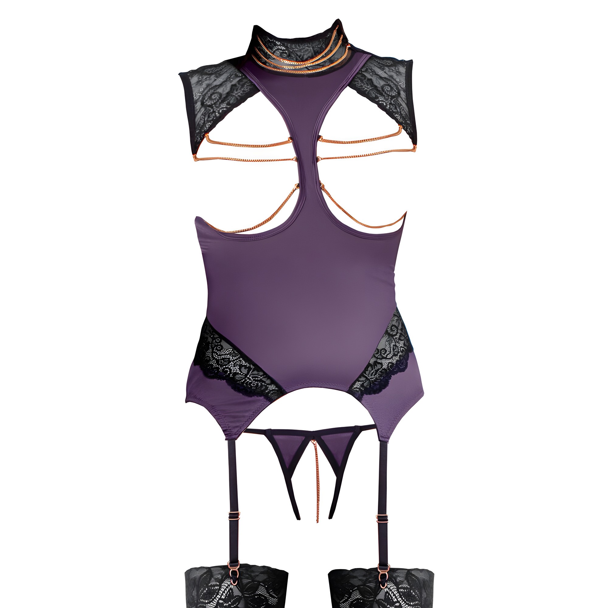 Este provocativo atuendo combina satén morado elástico con delicados insertos de encaje para un aspecto impresionante.