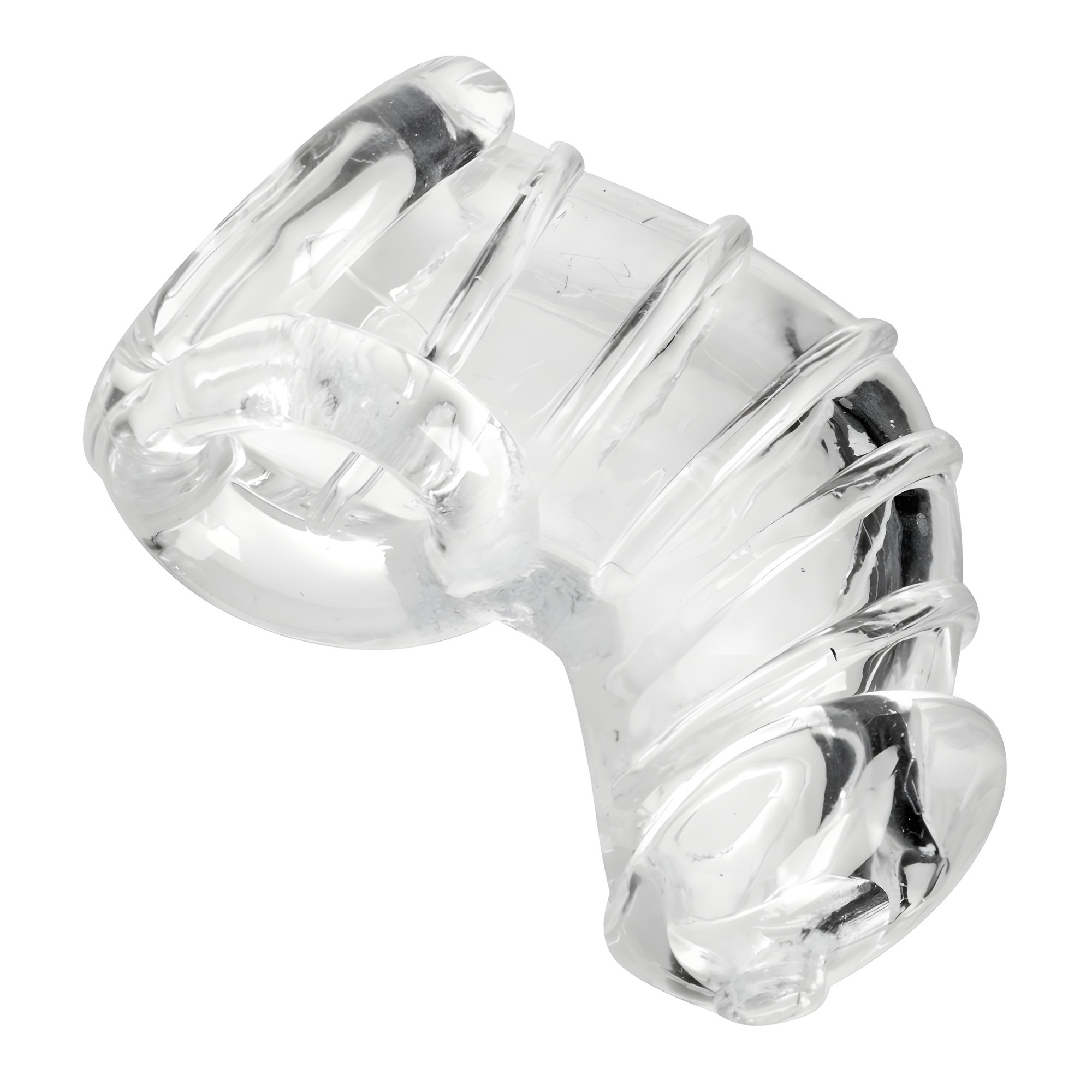 Hecha de goma suave, esta cárcel presenta una apertura para eyacular y cámaras separadas para mayor comodidad durante el uso prolongado.