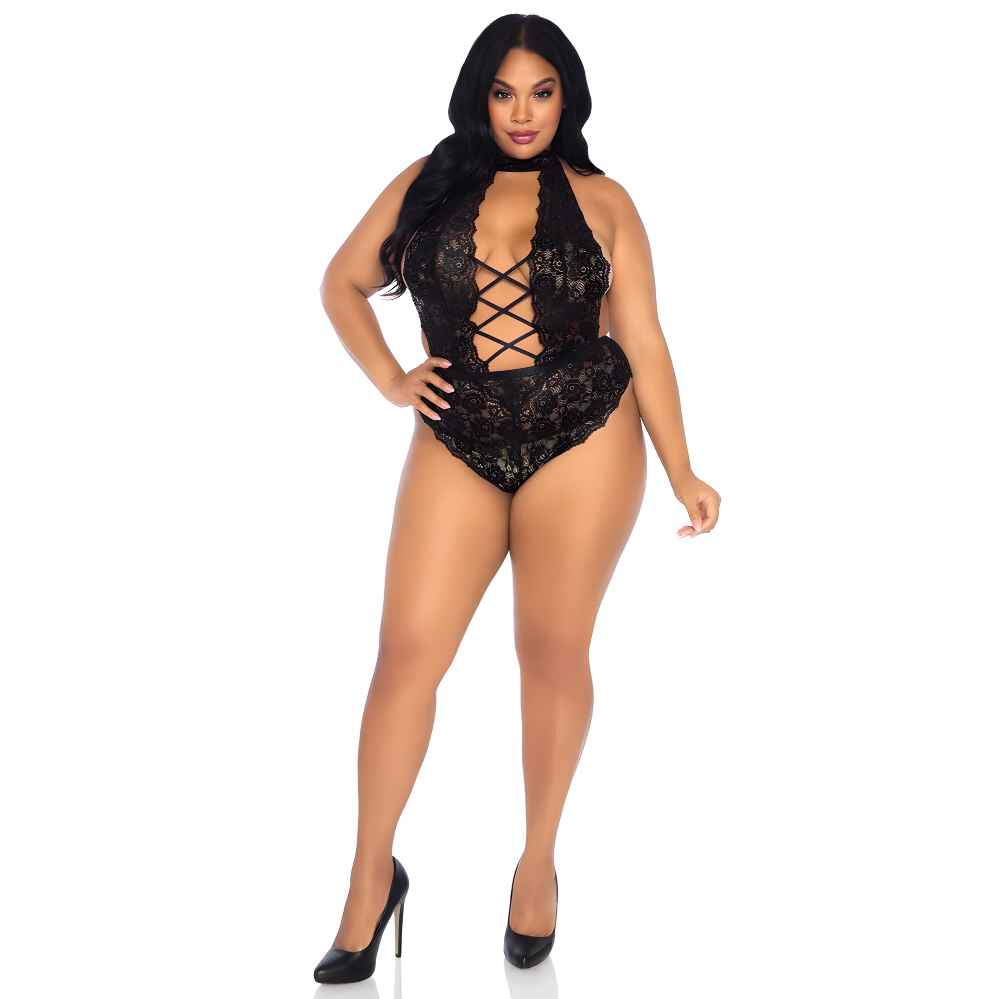 Este teddy de cuello alto y sin espalda presenta un seductor frente con cordones y un diseño sin entrepierna para un atractivo adicional.
