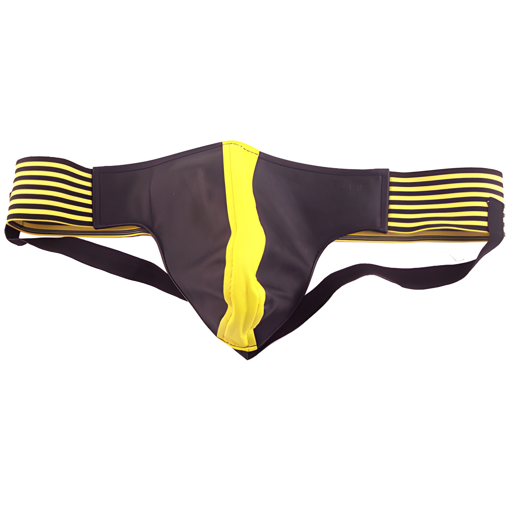Presume de tu lado deportivo con el Jock negro y amarillo de Rouge Garments.