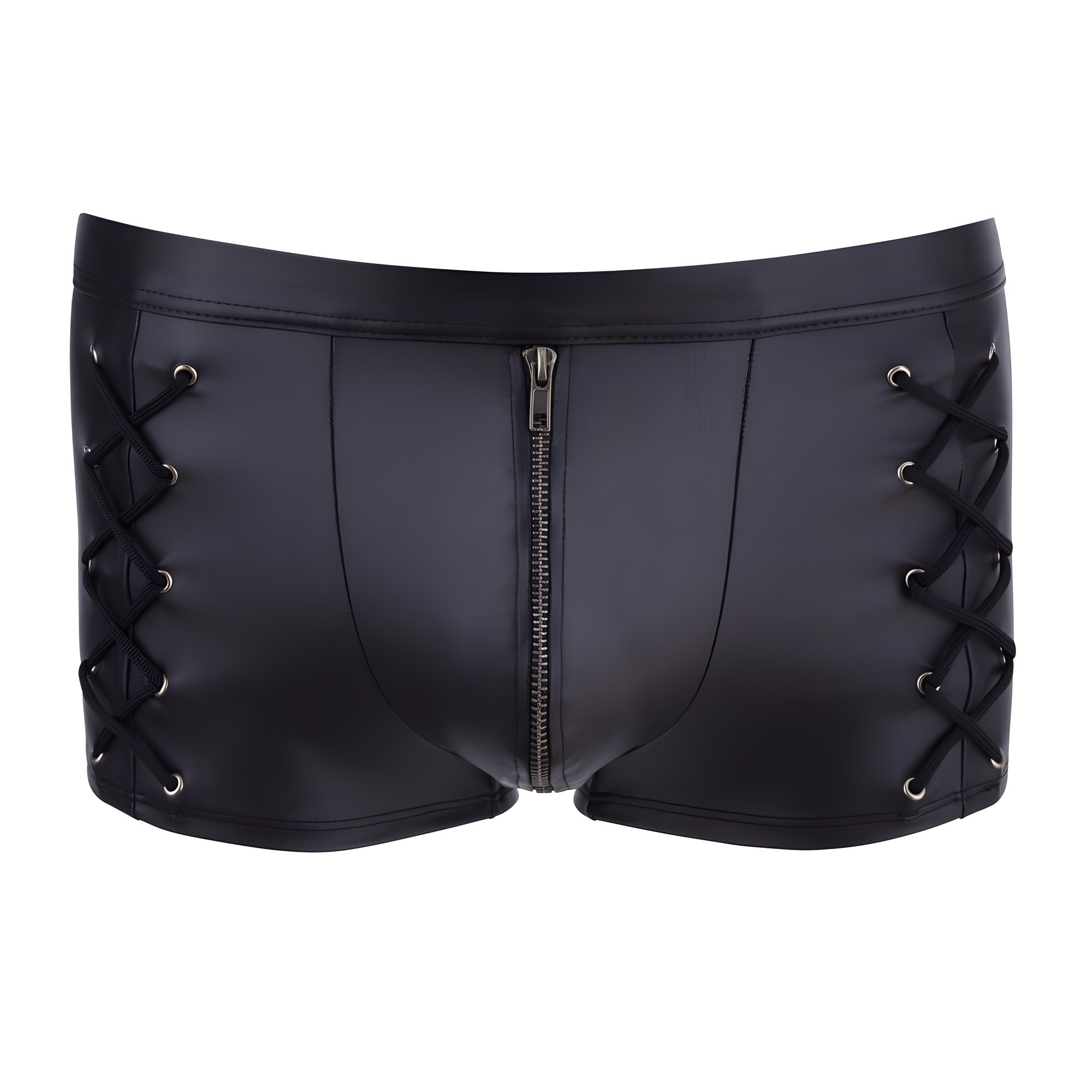 Estos pantalones distintivos presentan un elegante acabado mate con una cremallera de latón en la parte delantera y prominentes cordones en los lados.