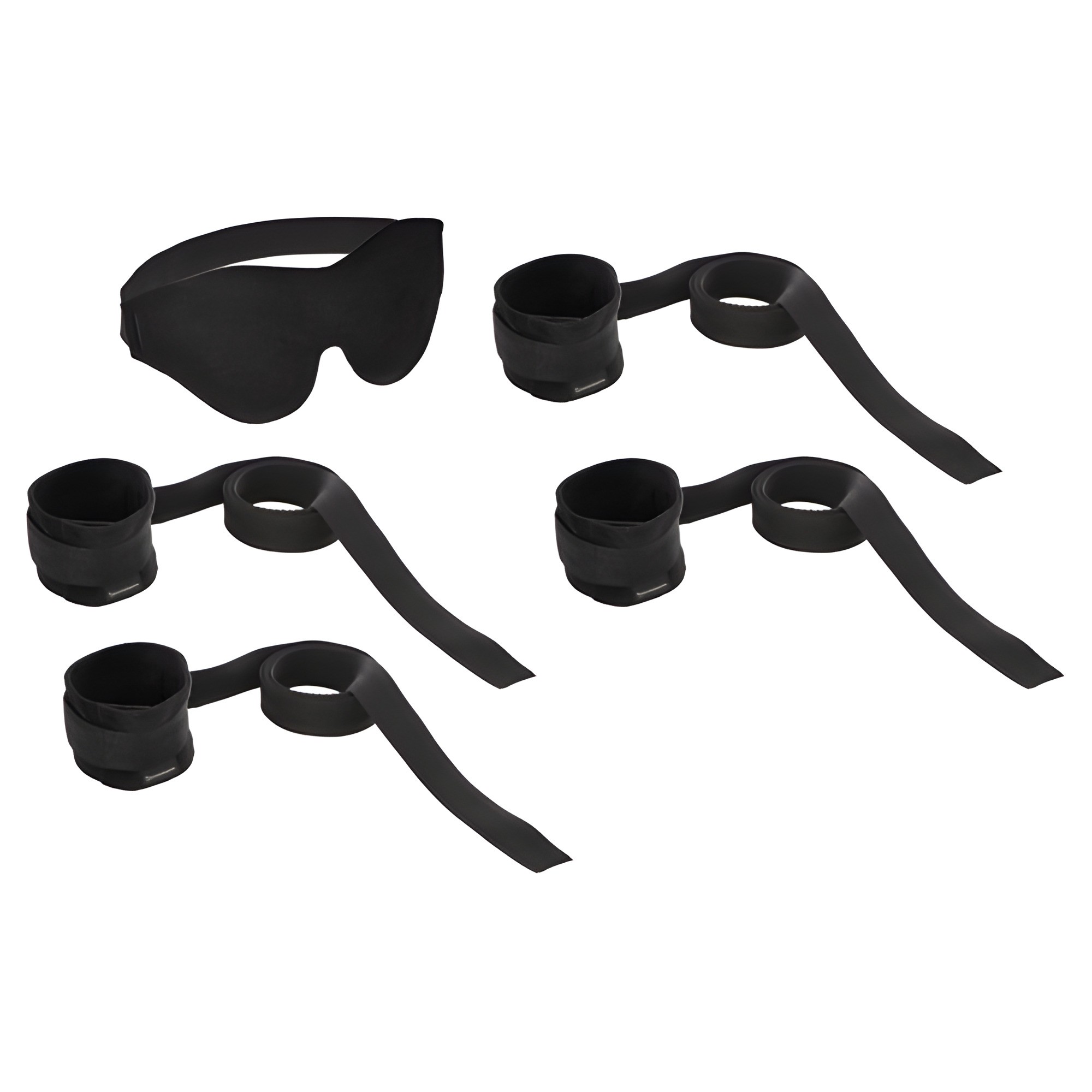 Con cuatro restricciones para muñecas y tobillos y una suave máscara negra, este kit es perfecto para tu primera aventura en el bondage erótico.